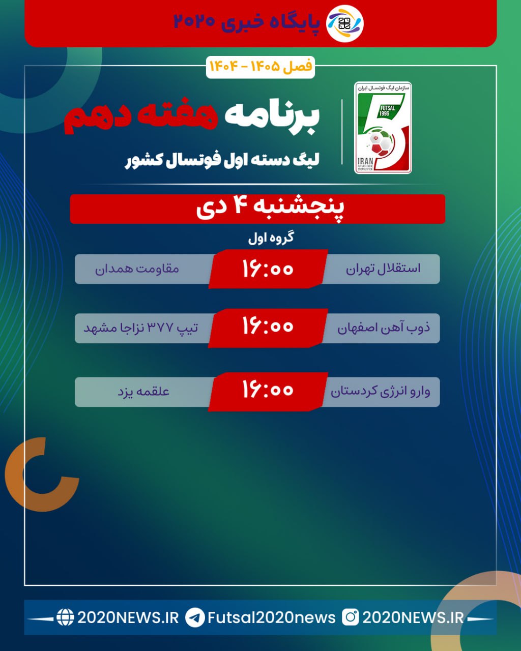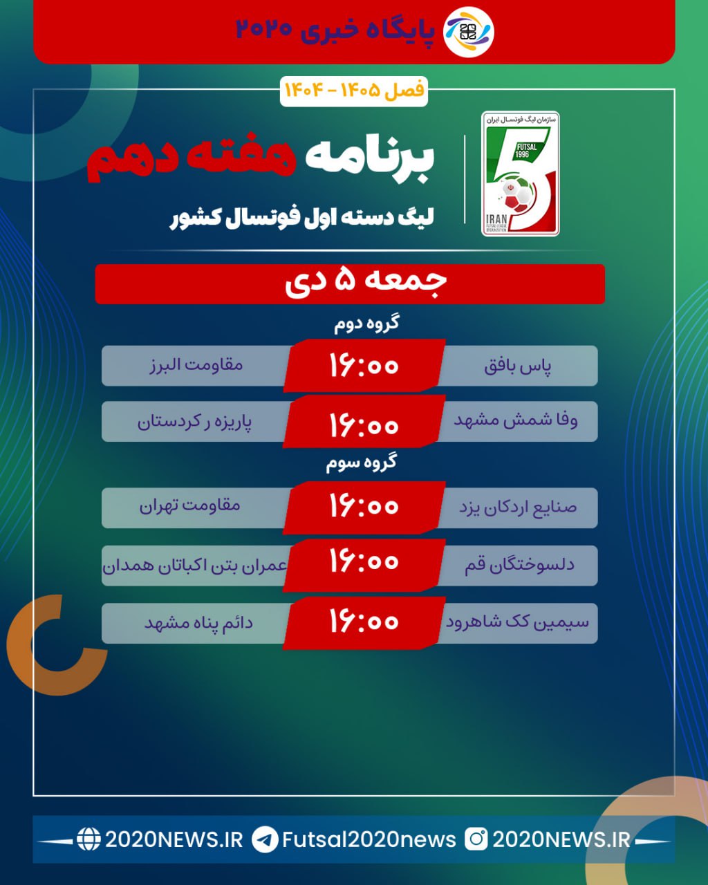 به گزارش پایگاه خبری ۲۰۲۰، دیدارهای روز دوم هفته نهم مرحله اول لیگ دسته یک فوتسال بزرگسالان کشور در گروه دوم و سوم عصر امروز برگزار شد.