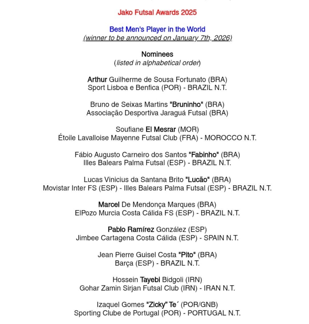 به گزارش پایگاه خبری ۲۰۲۰، سایت فوتسال پلنت (Futsal Planet) پس از اعلام اسامی نامزدهای عنوان برترین بازیکن فوتسال مردان جهان در سال ۲۰۲۵، طی نظرسنجی، برترین بازیکن را اعلام کرد.