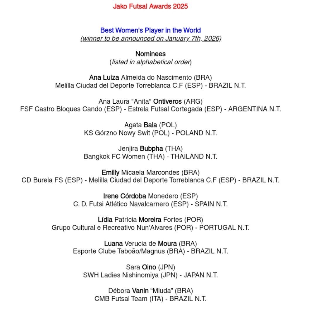 به گزارش پایگاه خبری ۲۰۲۰، سایت فوتسال پلنت (Futsal Planet) پس از اعلام اسامی نامزدهای عنوان برترین بازیکن فوتسال زنان جهان در سال ۲۰۲۵، طی نظرسنجی، برترین بازیکن را اعلام کرد.